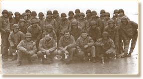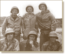 Standing left to right in dress blues are S1/c Mo Greenman, BM1/c Lewis Strickland, PhM3/c Al Silva, Cox Ed Marriott, PhM3/c Howard Hampton and seated, HA1/c David Catallo. Standing left to right on "Easy Red" Omaha Beach are SF2/c Ed Cash, HA1/c George Scott, and HA1/c George Whalen. Kneeling: S1/c Merle Clark, S1/c Charles Hoegen, and S1/c Donald Herbert.