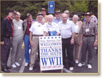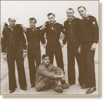 Platoon A-1 of the 6th NBB pose in their foul weather Army gear while training on the beaches of England. In addition to the Navy medical corps, this rare photo, published in "Spearheading D-Day," includes the hydrographic, communications and small boat repair section. Dr. Frank Ramsey, Beachmaster David Waddy and Ensign Ralph Wood have removed their helmets. Dr. Ramsey was seriously injured on D-Day when a chunk of his shoulder was blown off by a Nazi artillery shell. Refusing evacuation, he suffered intensely on a stretcher while providing triage instructions to his USN corpsmen. And, more than half a century later at a reunion in Atlanta, GA, left to right: LCDR Joe Vaghi, PhM3/c Andy Chmiel, Cox Herb Goodick, S1/c John Hanley, RM1/c John Gallagher, BM2/c Mario Mesa, CM3/c Gino Carlucci, S3/c Ray Castor, and RM3/c Richard Gibler.